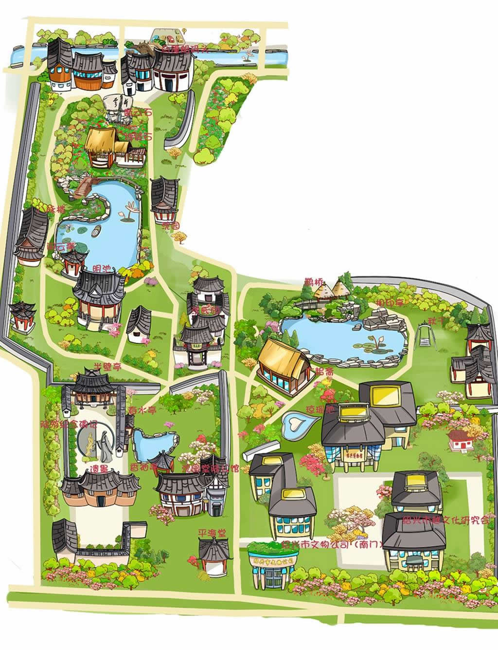 沈園主要由古跡區(qū)、東苑和南苑(陸游紀(jì)念館和連理園)三大部分組成,形成了“斷云悲歌”、“詩(shī)境愛(ài)意”、“春波驚鴻”、“殘壁遺恨”、“孤鶴哀鳴”、“碧荷映日”、“宮墻怨柳”、“踏雪問(wèn)梅”、“詩(shī)書(shū)飄香”和“鵲橋傳情”等十景。