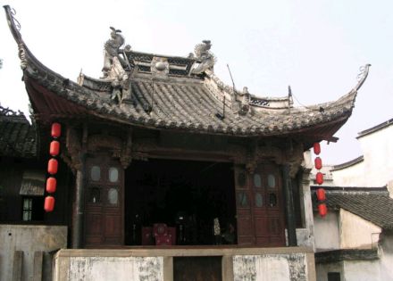 修真觀古戲臺(tái)是道觀的附屬建筑,建于清乾隆十四年(1749),與修真觀一樣屢遭毀損,但民國八年(1919)年修繕后,便一直保持至今。戲臺(tái)占地204平方米,北隔觀前街與修真觀相對(duì),南臨東市河,東倚興華橋。戲臺(tái)為歇山式屋頂,飛檐翹角,莊重中透著秀逸。梁柱之間的雀替均為精致的木雕,藝術(shù)價(jià)值極高。臺(tái)為兩層,底層用磚石圍砌 ,進(jìn)出有邊門和前門。邊門通河埠,底層后部有小梯通樓臺(tái),亦可通過翻板門從河埠下到船里。樓臺(tái)分前后兩部分,后部是化妝室,雕花矮窗,寬敞明亮;前部是戲臺(tái),正對(duì)廣場。