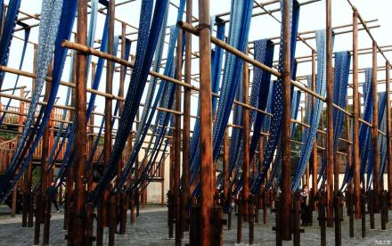 草本染色作坊是手工環(huán)保印染晾曬大型工坊。曬布場地以青磚鋪就,豎立著密密麻麻的高桿和階梯式曬布架,規(guī)模相當(dāng)龐大。草木本色染坊除了以藍(lán)草為原料漿染制作藍(lán)印花布工藝外,還有獨(dú)特的彩烤工藝流程。彩烤色彩豐富,是從當(dāng)?shù)氐牟菽驹现刑崛〉,像茶葉、桑樹皮、烏桕樹葉都是提取色彩的原料,所以這個(gè)染坊在當(dāng)?shù)亟凶霾菽颈旧痉弧?
